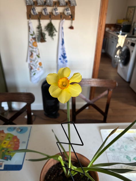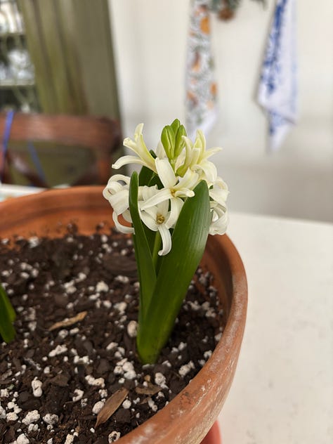For those of you desperate to know how my forced bulb experiment turned out, I’m giving it a 7. The hyacinths bloomed first, but I recycled bulbs from last year and the display was subpar, but still fragrant, which to me is just as important. The daffodils took much longer, almost seven weeks from when I brought them indoors. They’re lovely, just took longer than expected. If you are local, the TR Walmart has small pots of hyacinth and tete-a-tete daffodil bulbs for $2. This is an easy, cheap way to get something bright and happy on your table—just slip the bulbs out of their plastic pots and into something a little nicer.