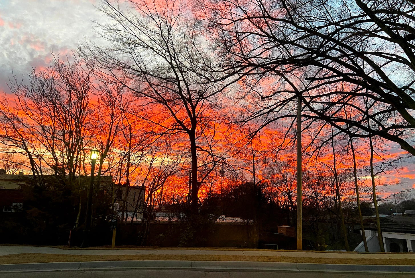 BUT—but but but—in the winter, sunsets align with our side porch, and since the trees are bare, that bold burning light filters through the branches, and the contrast is glorious. There’s a way trees cling to winter, to fading light. They’re reluctant and reaching at the same time, as if saying to spring, “Wait, wait, wait, we are not ready yet. This is the time for grounding.”